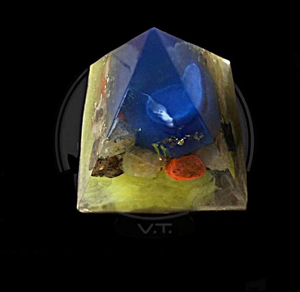 PYRAMIS SAA ( XL)Κατασκευασμένη με ενεργειακά ακατέργαστα πετρώματα και ρινίσματα μαγνητικών μετάλλων, σε συνδυασμό, πάντοτε, με φυσικά (υγρά) χρώματα φυτών, καθώς και άλλα, στερεά υλικά, τα οποία, θωρακίζονται σε γυαλί, που κατασκευάζεται με ειδική ρητίνη, είτε διάφανη είτε χρωματιστή. Η ρητίνη αυτή με τα εσωτερικά ενεργειακά υλικά , τα οποία θεωρούνται ιδανικά για την άμεση ρύθμιση των τσάρκας , καθιστά το εν λόγω, κατάλληλο για την κάλυψη χώρων με επιφάνεια, ακόμη και των 40 τ.μ.